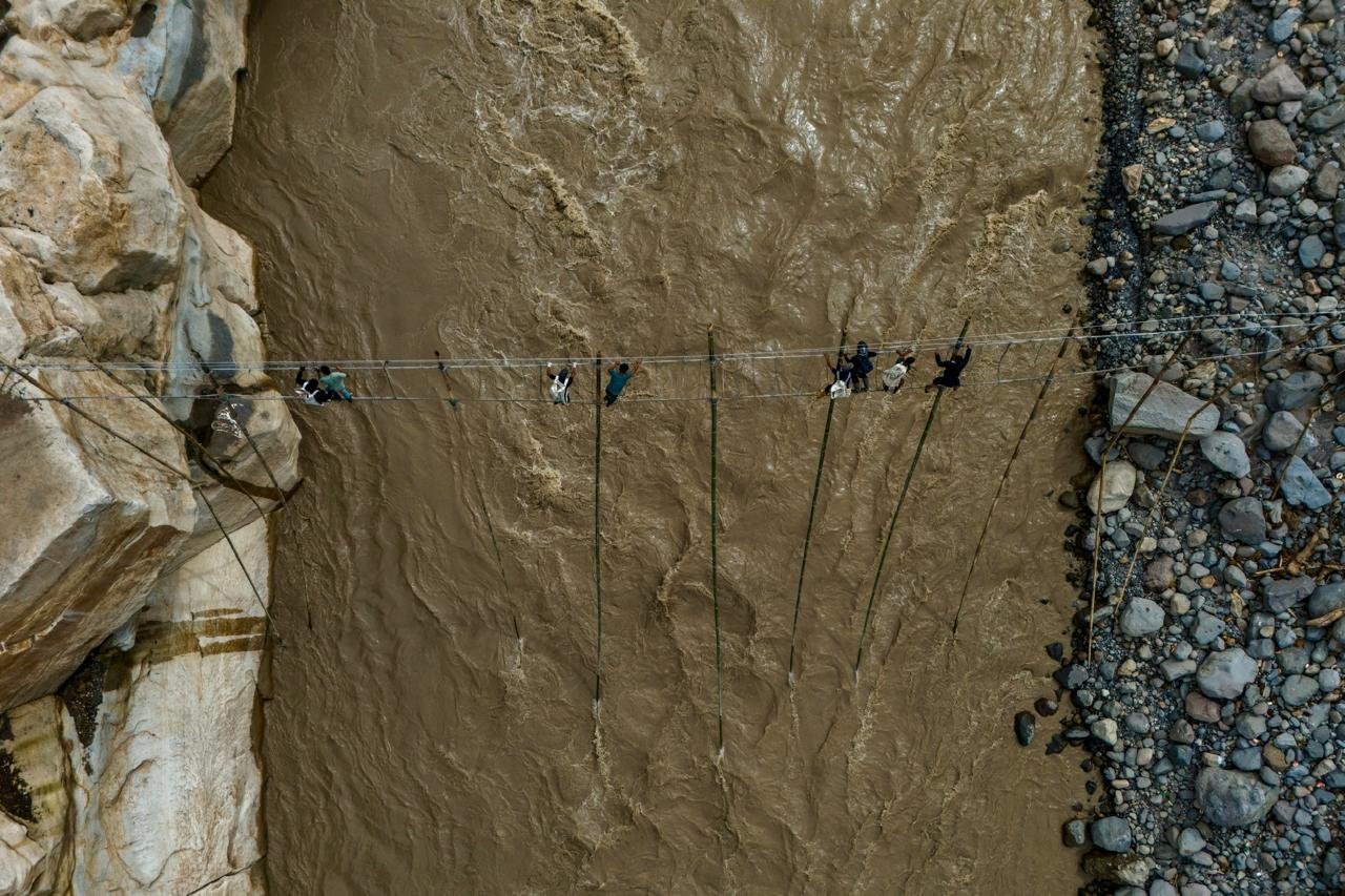 Foto udara merekam bagaimana air membentuk ulang tepian sungai, memperlebar alur dan melahirkan muara-muara baru. Tanah subur berubah menjadi ruang yang tak lagi pasti.
